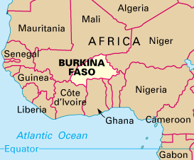 Is a landlocked country in West Africa around 274,200 square kilometres in size. It is surrounded by: Mali to the north; Niger to the east; Benin to the southeast; Togo and Ghana to the south; and Ivory Coast to the southwest. Its capital is Ouagadougou, their main religions are Islamic and Christianity and the official language is french. In 2014, its population was estimated at just over 17.3 million.